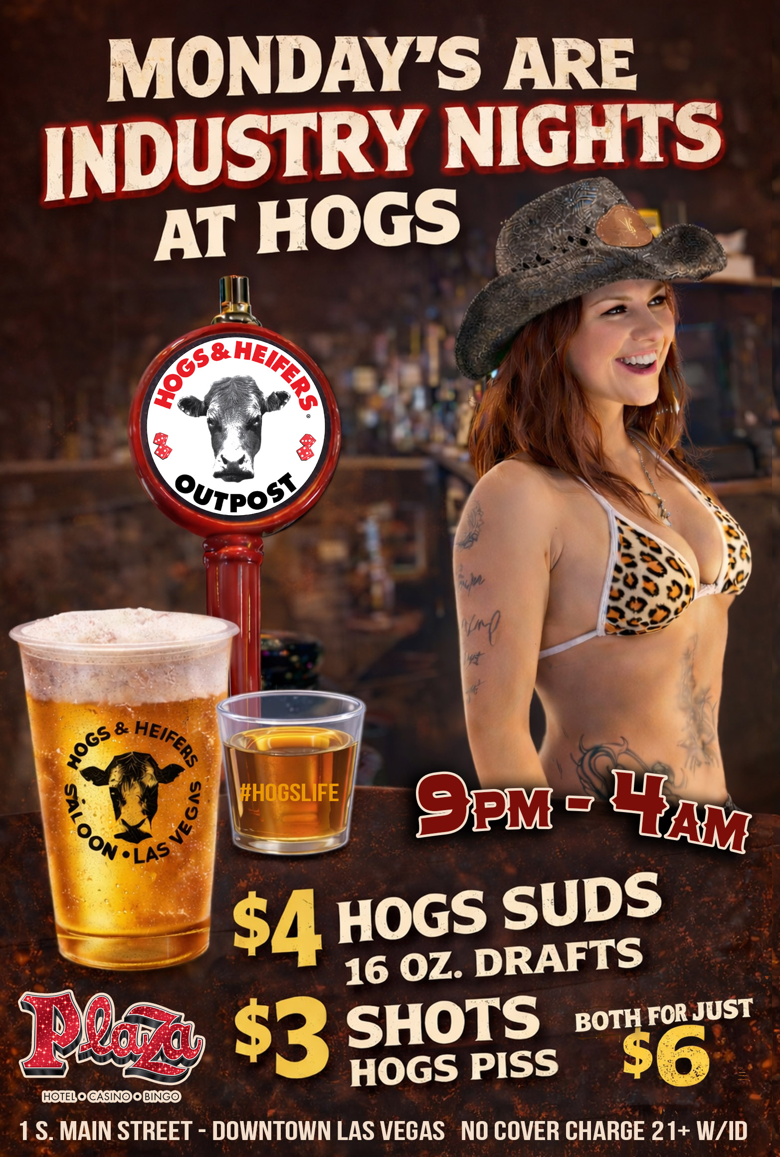 Whether you’re riding into town for the party or just need a place to crash after dancing on the bar at Hogs & Heifers OUTPOST, the Plaza Hotel & Casino has your back—with 20% OFF rooms!