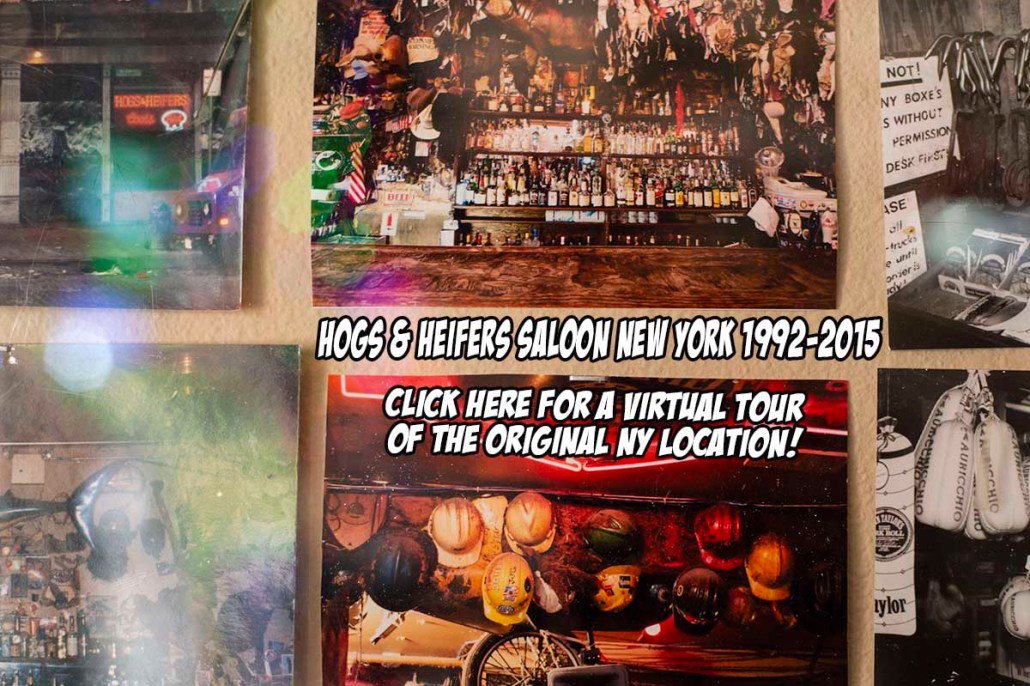 The idea for opening a bar and calling it Hogs & Heifers was conceived in, of all places, a bar. Allan Dell was a self-proclaimed functioning alcoholic and figured he spent enough time sitting at a bar and that he might as well make some money while he sat there. Allan’s two friends and drinking buddies were a Master Carpenter and a Graphic Design Artist and he talked them into helping him build a bar. They would all drink for free and get laid regularly and for three broke guys in their early to mid twenties, who could ask for anything more. Allan’s father agreed to finance his project if he could find an experienced bar owner to “father” him in the business. Enter Tom McNeil, legend in the Dive Bar business. McNeil owned the Village Idiot in Manhattan’s East Side, which was the Boys’ favorite watering hole, where they could sit for hours drinking ice cold Pabst Blue Ribbon for a $1.75 a can. Allan knew that he wanted to open a bar that had to do with motorcycles and women and the original logo did, in fact, include an illustration of a chopper. The Boys were trying to come up with a name, while sitting in the Village Idiot one afternoon…”Hogs & something”. On the wall above the bar was a sign for a Heifer Auction, and a heifer being a cow that has not yet been bred, is essentially a virgin cow. The name Hogs & Heifers was born. The fact that the bar ended up being in a real meat market was simply due to the affordable rent at the time, but it was a perfect match and had a great deal to do with the success of the business.