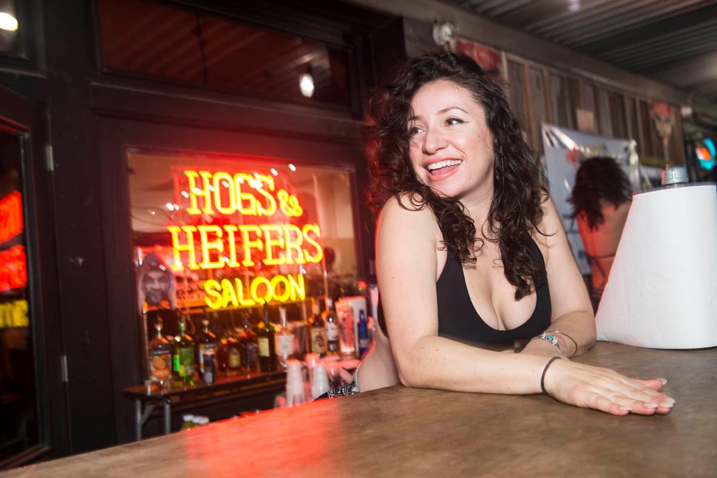The idea for opening a bar and calling it Hogs & Heifers was conceived in, of all places, a bar. Allan Dell was a self-proclaimed functioning alcoholic and figured he spent enough time sitting at a bar and that he might as well make some money while he sat there. Allan’s two friends and drinking buddies were a Master Carpenter and a Graphic Design Artist and he talked them into helping him build a bar. They would all drink for free and get laid regularly and for three broke guys in their early to mid twenties, who could ask for anything more. Allan’s father agreed to finance his project if he could find an experienced bar owner to “father” him in the business. Enter Tom McNeil, legend in the Dive Bar business. McNeil owned the Village Idiot in Manhattan’s East Side, which was the Boys’ favorite watering hole, where they could sit for hours drinking ice cold Pabst Blue Ribbon for a $1.75 a can. Allan knew that he wanted to open a bar that had to do with motorcycles and women and the original logo did, in fact, include an illustration of a chopper. The Boys were trying to come up with a name, while sitting in the Village Idiot one afternoon…”Hogs & something”. On the wall above the bar was a sign for a Heifer Auction, and a heifer being a cow that has not yet been bred, is essentially a virgin cow. The name Hogs & Heifers was born. The fact that the bar ended up being in a real meat market was simply due to the affordable rent at the time, but it was a perfect match and had a great deal to do with the success of the business.