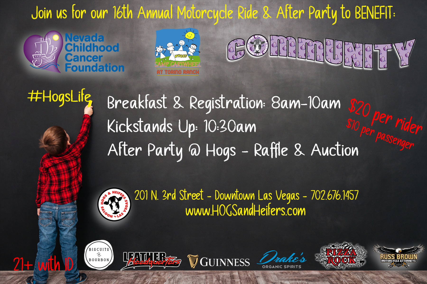 Our 16th Annual Hog Wild for Kids will kick off with rider registrations taking place at Hogs & Heifers from 8am – 10am with kickstands up at 10:30am.