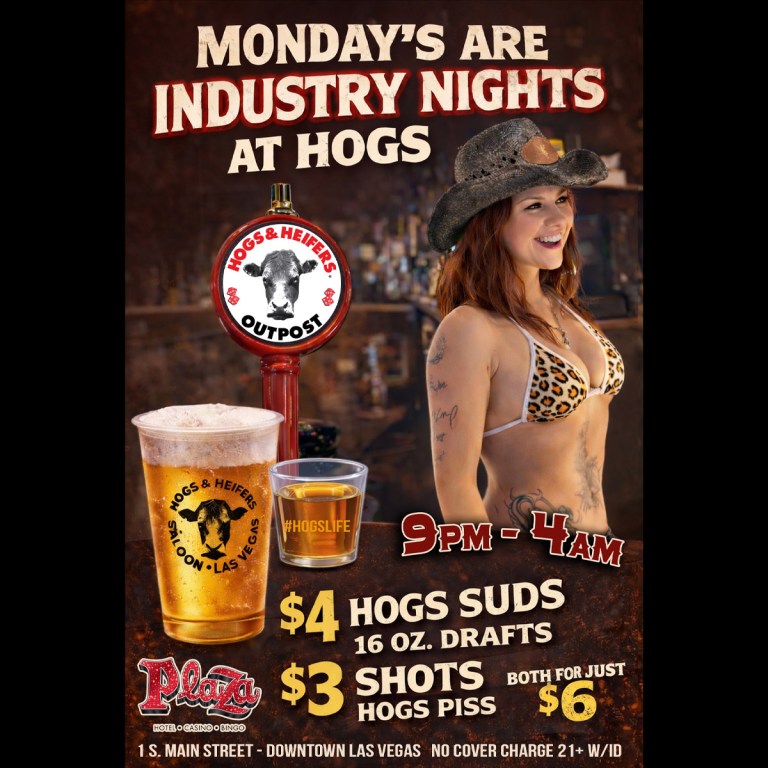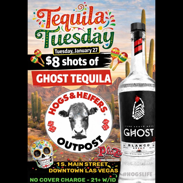 MONDAY NIGHTS = INDUSTRY NIGHT at the OUTPOST SERVICE INDUSTRY FAM….this one’s for you.Clock out, roll in, and let Hogs & Heifers OUTPOST take it from there. Hogs Suds 16oz Drafts – $4Hogs Piss Shot – $3Make it a Combo for $6 9pm – 4am1 S. Main Street – Downtown Las Vegas Inside the PLAZA HOTEL & CASINO NO COVER • 21+ w/ ID Just flash your Service Industry Employment proof at the door and dive into the rowdiest Monday in Vegas.Let’s make the start of the week feel like the weekend. TEQUILA TUESDAY is BACK at Hogs! And we’re turning up the heat with $8 shots of GHOST TEQUILA — all day long on Tuesday, January 27th. Slide into the Hogs & Heifers OUTPOST inside The PLAZA HOTEL & CASINO and kick your Tuesday into high gear. No cover charge, just good vibes, strong pours, and that classic Hogs energy that never quits. 1 S. Main Street – Downtown Las Vegas OPEN 2pm – 4am 2 Entrances – Off Main Street & through the casino 21+ w/ID Let’s haunt those shot glasses. Ghost style. SHOP OUR BRAND NEW HOGS & HEIFERS SALOON #HOGSWARES WEBSITE SHOP #HOGSWARES NOW Share this: Email a link to a friend (Opens in new window) Email Share on Facebook (Opens in new window) Facebook Share on X (Opens in new window) X Share on Tumblr (Opens in new window) Tumblr Share on Reddit (Opens in new window) Reddit Share on Pinterest (Opens in new window) Pinterest Like this:Like Loading...